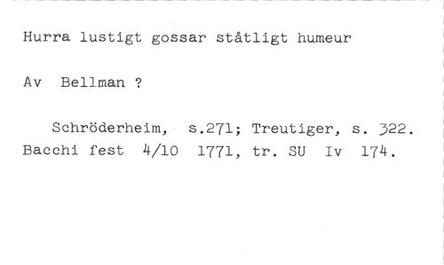Hurra lustigt gossar ståtligt humeur Bellman ? //// Schröderheim, s.271; Treutiger, s. 322. Bacchi fest 4/10 1771, tr. SU Iv 174.