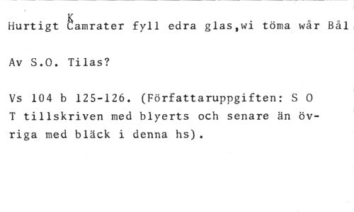 Hurtigt bamrater fyll edra glas,wi törna wår Bål, Av S.O. Tilas? //// Vs 104 b 125-126. (Författaruppgiften: S 0 T tillskriven med blyerts och senare än övriga med bläck i denna hs).