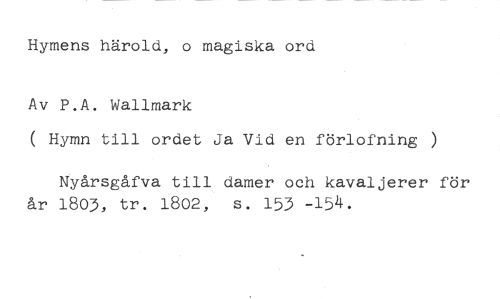 Hymens härold, o magiska ord //// Av P.A. Wallmark //// ( Hymn till ordet Ja Vid en förlofning ) //// Nyårsgåfva till damer och kavaljerer för år 1803, tr. 1802, s. 153 -154.