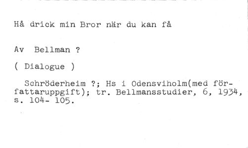 Hå drick min Bror när du kan få //// Av Bellman ? ( Dialogue ) //// Schröderheim ?; Hs i Odensviholm(med författaruppgift); tr. Bellmansstudier, 6, 1934, s. 104- 105.