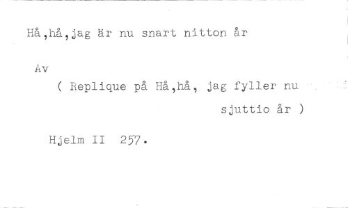 Hå,hå,jag är nu snart nitton år //// Av //// ( Replique på Hå,hå, jag fyller nu //// sjuttio år ) //// Hjelm II 257.