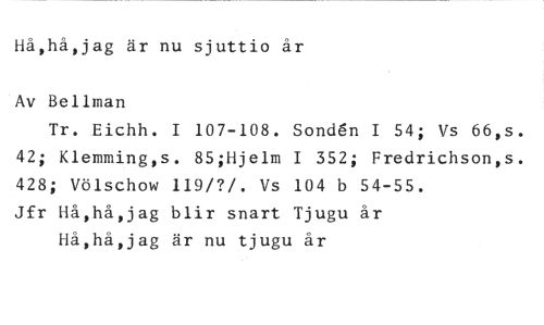 Hå,hå,jag är nu sjuttio år //// Av Bellman //// Tr. Eichh. I 107-108. Sond6n I 54; Vs 66,s. 42; Klemming,s. 85;Hjelm I 352; Fredrichson,s. 428; Völschow 119/?/. Vs 104 b 54-55. //// Jfr Hå,hå,jag blir snart Tjugu år //// Hå,hå,jag är nu tjugu år