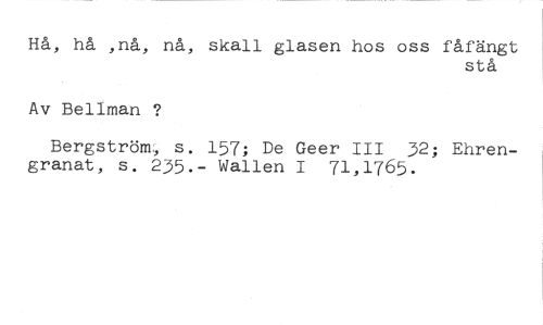 Hå, hå ,nå, nå, skall glasen hos oss fåfängt //// stå //// Av Bellman ? //// Bergström:, s. 157; De Geer III 32; Ehrengranat, s. 235.- Wallen I 71,1765.