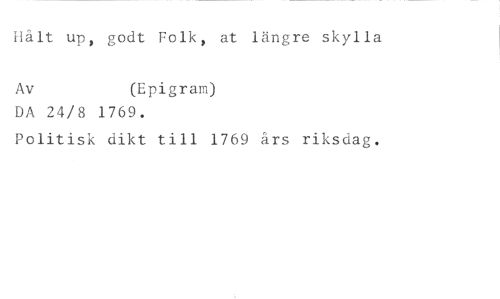 Tålt up, godt Folk, at längre skylla //// Av (Epigram) //// DA 24/8 1769. //// Politisk dikt till 1769 års riksdag.