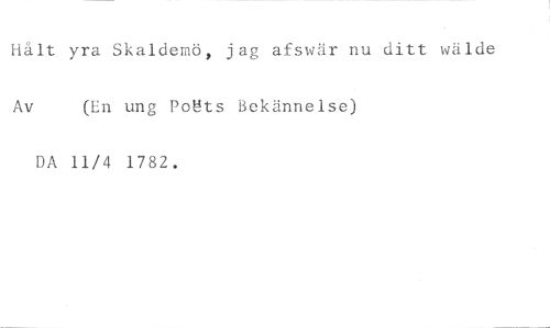 Hålt yra Skaldemö, jag afswär nu ditt wälde //// Av (En ung Pofts Bekännelse) //// DA 11/4 1782.