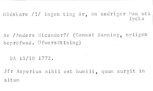 Hädskare /!/ ingen ting är, än nedriger Man uti //// lycka //// Av /Anders Nicander?/ (Gammal Sanning, nyligen bepröfwad. öfwersättning) //// DA 13/10 1772. //// Jfr Asperius nihil est humili, quum surgit in altum