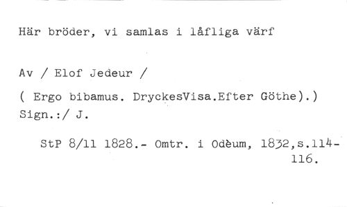 Här bröder, vi samlas i låfliga värf Av / Elof Jedeur //// /( Ergo bibamus. DryckesVisa.Efter Göthe).) Sign.:/ J. //// StP 8/11 1828.- Omtr. i Odhum, 1832,s.114- //// 116.
