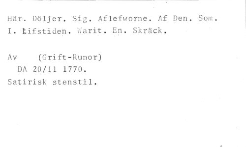 Här. Döljer. Sig. Aflefworne. Af Den. Som. I. tifstiden. Warit. En. Skräck. //// Av (Grift-Runor) //// DA 20/11 1770. //// Satirisk stenstil.