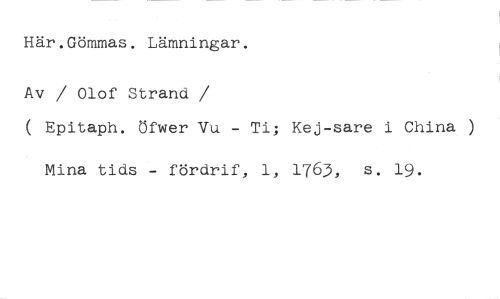 Här.Gömmas. Lämningar. //// Av / Olof Strand //// /( Epitaph. öfwer Vu - Ti; Kej-sare i China //// Mina tids - fördrif, 1, 1763, s. 19.