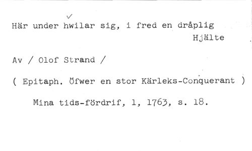 VI //// Här under hwilar sig, i fred en dråplig //// Hjälte //// Av / Olof Strand //// /( Epitaph. öfwer en stor Kärleks-Conquerant ) Mina tids-fördrif, 1, 1763, s. 18.