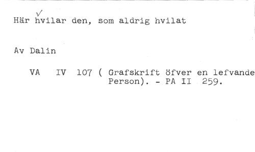 V //// Här hyllar den, som aldrig hyllat //// Av Dalin //// VA IV 107 ( Grafskrift öfver en lefvande Person). - PA II 259.