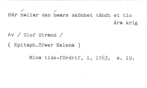 Här hwilar den hwars skönhet tändt et tio //// åra krig //// Av / Olof Strand //// /( Epitaph.Öfwer Helena ) //// Mina tids-fördrif, 1, 1763, s. 19.
