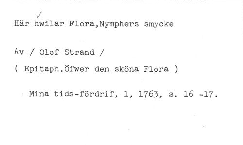 V //// Här hwilar Flora,Nymphers smycke //// Av / Olof Strand //// /( Epitaph.öfwer den sköna Flora ) //// Mina tids-fördrif, 1, 1763, s. 16 -17.