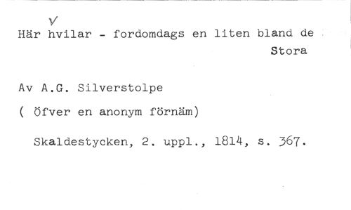 v //// Här hvilar - fordomdags en liten bland de //// Stora //// Av A.G. Silverstolpe //// ( öfver en anonym förnäm) //// Skaldestycken, 2. uppi., 1814, s. 367.