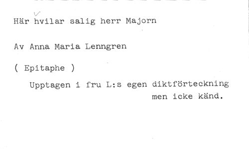 Här hvilar salig herr Majorn //// Av Anna Maria Lenngren ( Epitaphe ) //// Upptagen i fru L:s egen diktförteckning //// men icke känd.