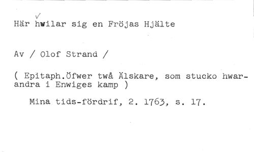 Här hwilar sig en Fröjas Hjälte Av / Olof Strand //// /( Epitaph.öfwer twå Älskare, som stucko hwarandra i Enwiges kamp ) //// Mina tids-fördrif, 2. 1763, s. 17.