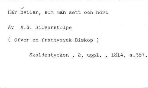Här hyllar, som man sett och hört //// Av A.G. Silverstolpe //// ( öfver en fransysysk Biskop ) //// Skaldestycken , 2, uppl. , 1814, s.367.