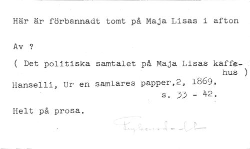 Här är förbannadt tomt på Maja Lisas i afton Av ? //// ( Det politiska samtalet på Maja Lisas kaffe- //// hus ) //// Hanselli, Ur en samlares papper,2, 1869, //// s. 33 - 42. //// Helt på prosa.