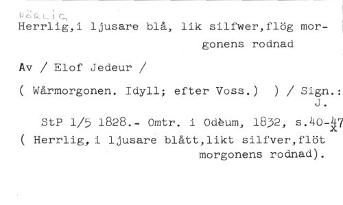 Herrlig,i ljusare blå, lik silfwer,flög mor- //// gonens rodnad //// Av / Elof Jedeur //// /( Wårmorgonen. Idyll; efter Voss.) ) / Sign.: //// J. //// StP 1/5 1828.- Omtr. i OcAum, 1832, s.4017 //// ( Herrlig, i ljusare blått,likt silfver,flöt //// morgonens rodnad).