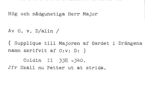 Hög och nådgunstiga Herr Major Av 0. v. D/alin //// /( Supplique till Majoren af Gardet i Drängens namn skrifvit af 0:v: D: ) //// soldin II 338 -340. //// Jfr Skall nu Petter ut at strida.