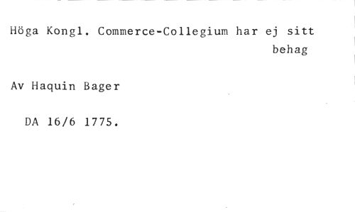 Höga Kongl. Commerce-Collegium har ej sitt //// behag //// Av Haquin Bager //// DA 16/6 1775.
