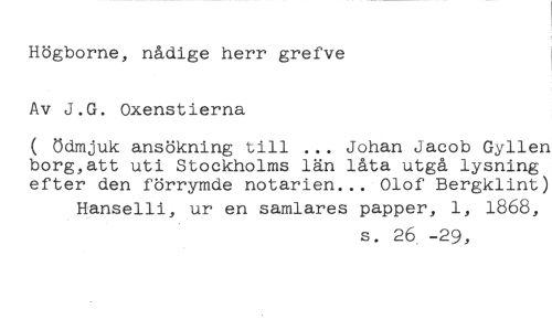 Högborne, nådige herr grefve Av J.G. Oxenstierna //// ( ödmjuk ansökning till ... Johan Jacob Gyllen borg,att uti Stockholms län låta utgå lysning efter den förrymde notarien... Olof Bergklint) //// Hanselli, ur en samlares papper, 1, 1868, //// s. 26, -29,