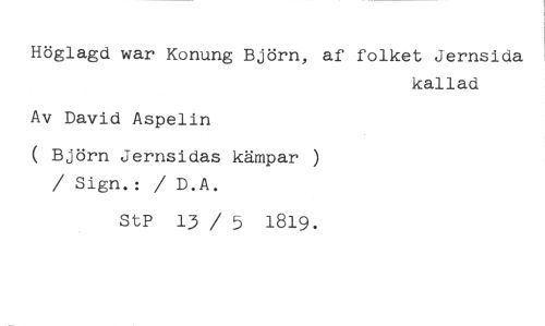 Höglagd war Konung Björn, af folket Jernsida //// kallad //// Av David Aspelin //// ( Björn Jernsidas kämpar / Sign.: / D.A. //// StP 13 / 5 1819.