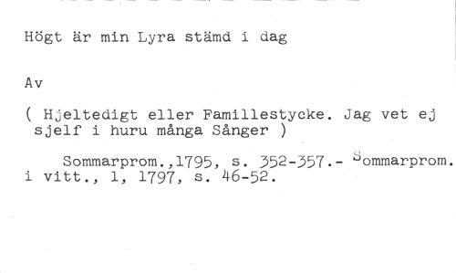 Högt är min Lyra stämd i dag //// Av Jag vet ej 'ommarprom. //// ( Hjeltedigt eller Famillestycke. sjelf i huru många Sånger ) //// Sommarprom.,1795, s. 352-357. i vitt., 1, 1797, s. 46-52.