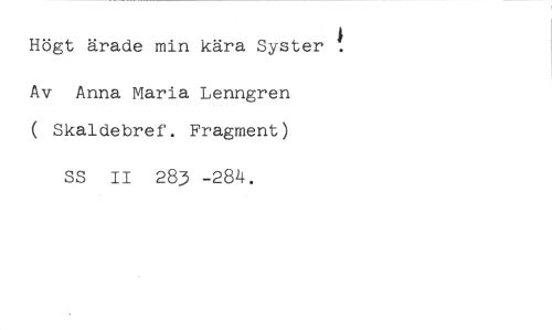 Högt ärade min kära Syster ! //// Av Anna Maria Lenngren ( Skaldebref. Fragment) //// ss II 283 -284.