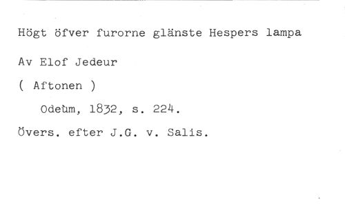 Högt öfver furorne glänste Hespers lampa //// Av Elof Jedeur //// ( Aftonen ) //// Odetim, 1832, s. 224. //// Övers. efter J.G. v. Salis.