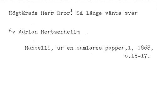 Högtärade Herr Bror! Så länge vänta svar Av Adrian Hertzenheilm //// Hanselli, ur en samlares papper,l, 1868, //// s.15-17.