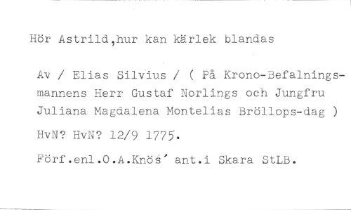 Hör Astrild2hur kan kärlek blandas //// Av / Elias Silvius / ( På Krono-Befalningsmannens Herr Gustaf Norlings och Jungfru Juliana Magdalena Montelias Bröllops-dag ) //// HvN? HvN? 12/9 1775. //// Förf.en1.0.A.Knöå' ant.i Skara StLB.