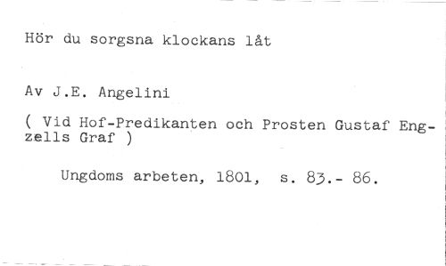 Hör du sorgsna klockans låt Av J.E. Angelini //// ( Vid Hof-Predikanten och Prosten Gustaf Engzells Graf ) //// Ungdoms arbeten, 1801, s. 83.- 86.