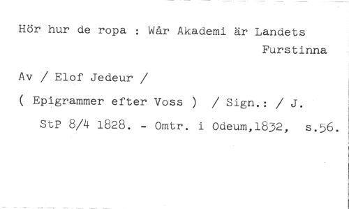 Hör hur de ropa : Wår Akademi är Landets //// Furstinna //// Av / Elof Jedeur //// /( Epigrammer efter Voss ) / Sign.: / J. //// StP 8/4 1828. - Omtr. i Odeum,1832, s.56.