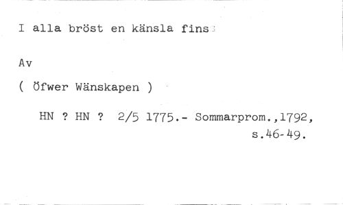 I alla bröst en känsla fins: //// Av //// ( Öfwer Wänskapen ) //// HN ? HN ? 2/5 1775.- Sommarprom.,1792, //// s.46-49.