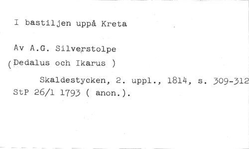 I bastiljen uppå Kreta //// Av A.G. Silvepstolpe (Dedalus och Ikarus ) //// Skaldestycken, 2. uppl., 1814, s. 309-312 StP 26/1 1793 ( anon.).