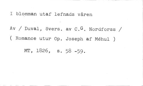 I blomman utaf lefnads våren //// Av / Duval, övers, av C.G. Nordforss / ( Romance utur Op. Joseph af Whul ) //// MT, 1826, s. 58 -59.