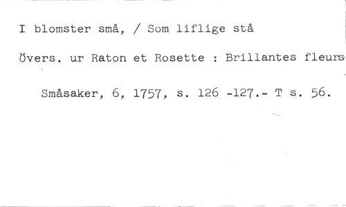 I blomster små, / Som liflige stå //// övers. ur Raton et Rosette : Brillantes fleurs //// Småsaker, 6, 1757, s. 126 -127.- T s. 56.