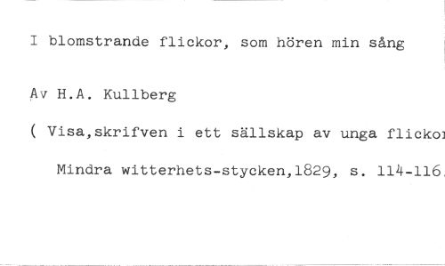 I blomstrande flickor, som hören min sång //// Av H.A. Kullberg //// ( Visa,skrifven i ett sällskap av unga flicko] Mindra witterhets-stycken,1829, s. 114-116.