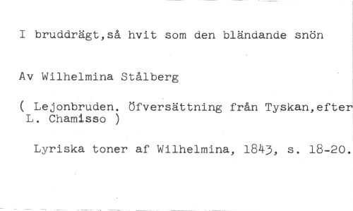 I bruddrägt,så hvit som den bländande snön Av Wilhelmina Stålberg //// ( Lejonbruden. öfversättning från Tyskan,efter L. Chamisso ) //// Lyriska toner af Wilhelmina, 1843, s. 18-20.
