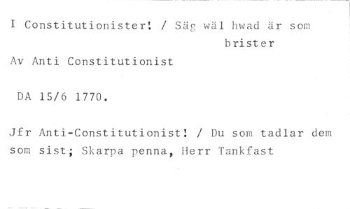 I Constitutionister! / Säg wäl hwad är som //// brister //// Av Anti Constitutionist //// DA 15/6 1770. //// Jfr Anti-Constitutionist! / Du som tadlar dem som sist; Skarpa penna, Herr Tankfast
