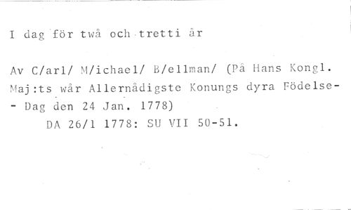 I dag för twå och tretti år //// Av C/arl/ M/ichael/ B/ellman/ (På Hans Kongl. Maj:ts wår Allernådigste Konungs dyra Födelse- Dag den 24 Jan. 1778) //// DA 26/1 1778: SU VII 50-51.