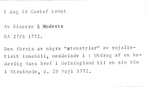 I dag är Gustaf krönt //// Av Sincere E Modeste DA 27/6 1772. //// Den första av några "stenstylar" av rojalistiskt innehåll, meddelade i : Utdrag af en hederlig Mans Bref i Helsingland til en sin Wän i Stockholm, d. 29 Maji 1772.