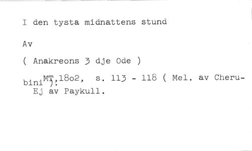 I den tysta midnattens stund //// Av //// ( Anakreons 3 dje Ode ) //// binits ,1B02, s. 113 - 118 ( Mel. av CheruEj av Paykull.