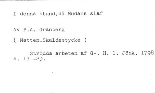 I denna stund,då Mödans slaf //// Av P.A. Granberg //// ( Natten.Skaldestycke ) //// Strödda arbeten af G-. H. 1. Jönk. 1798 s. 17 -23.