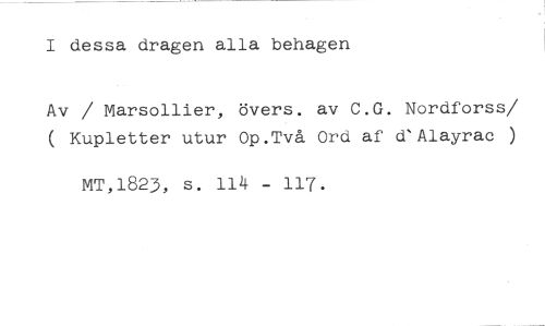 I dessa dragen alla behagen //// Av / Marsollier, övers. av C.G. Nordforss/ ( Kupletter utur Op.Två Ord af d'Alayrac ) //// MT,1823, s. 114 - 117.