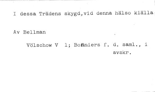 I dessa Trädens skygd,vid denna hälso kiälla //// Av Bellman //// Völschow V 1; Botniers f. d. saml., i //// avskr.