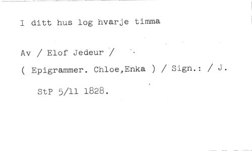 I ditt hus log hvarje timma //// Av / Elof Jedeur / • //// ( Epigrammer. Chloe,Enka ) / Sign.: //// StP 5/11 1828.