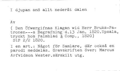I djupan snö allt nederåt dalen Av //// ( Den öfwergifnas Klagan wid Herr Bruks-Patronen---s Begrafning d.13 Jan. 1820.Upsala, tryckt hot Palmblad Comp., 1820) //// StP 2/2 1820. //// I en art.: Något för Samlare, där också en parodi meddelas. Gravskriften över: Marcus //// Arfvidson Wester.särskilt utg.