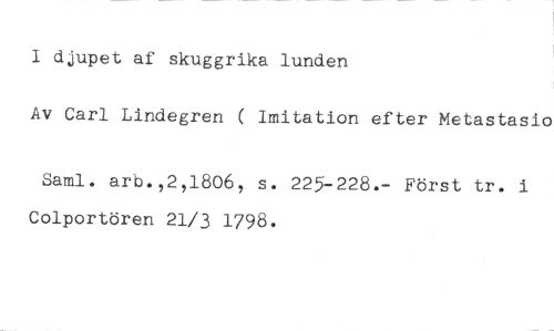 I djupet af skuggrika lunden //// Av Carl Lindegren ( Imitation efter Metastasio //// Saml. arb.,2,1806, s. 225-228.- Först tr. i Colportören 21/3 1798.